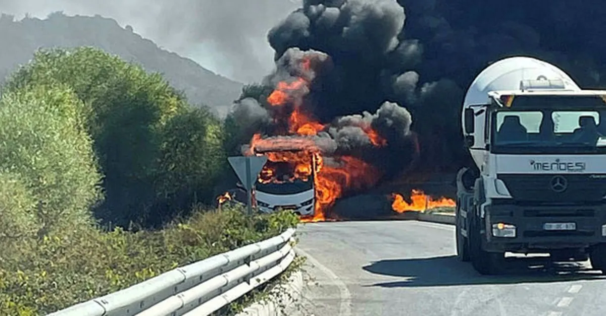 Aydın Kuşadası'nda Rus turistleri taşıyan midibüs, seyir halindeyken bir anda yangın çıktı. Kısa sürede alev topuna dönen midibüste bulunan 17 kişilik kafile tahliye edilirken, yangın güçlükle söndürüldü.