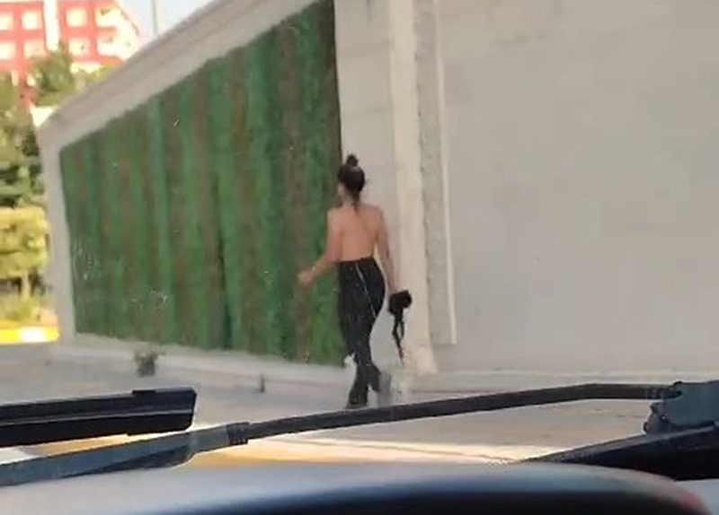 Kadının üstsüz yürüdüğü anlar, trafikteki bir kişi tarafından cep telefonuyla kayda alındı.