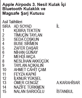 Apple Airpods 3. Nesil Kulak İçi Bluetooth Kulaklık ve Magsafe Şarj Kutusu kazanan yedek talihliler