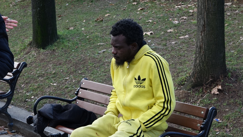Tir tir titrediği halde sıcak çayı da reddeden Nijeryalı gence parkın güvenlik amiri ayakkabı getirdi.