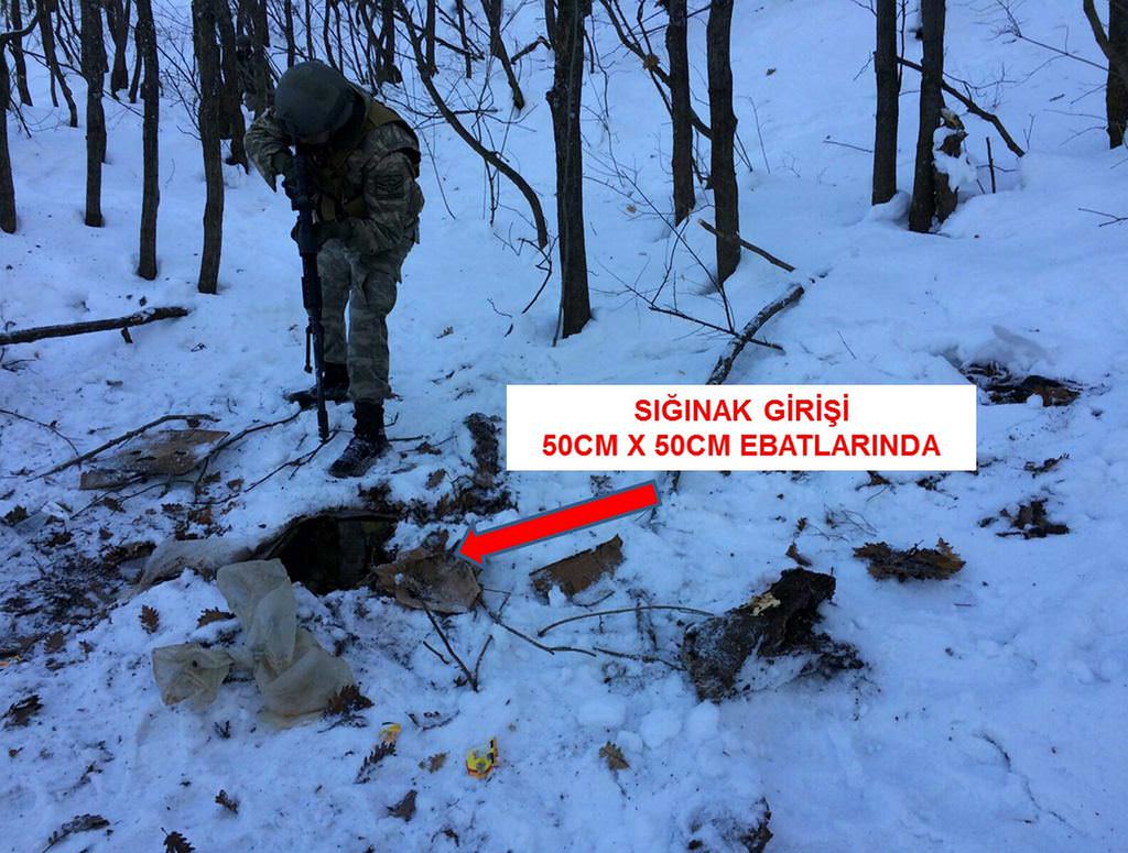 Güvenlik güçlerinin detaylı çalışmalarının ardından, karla kaplı ağaçlık alanda iki farklı girişi bulunan sığınak tespit edildi.