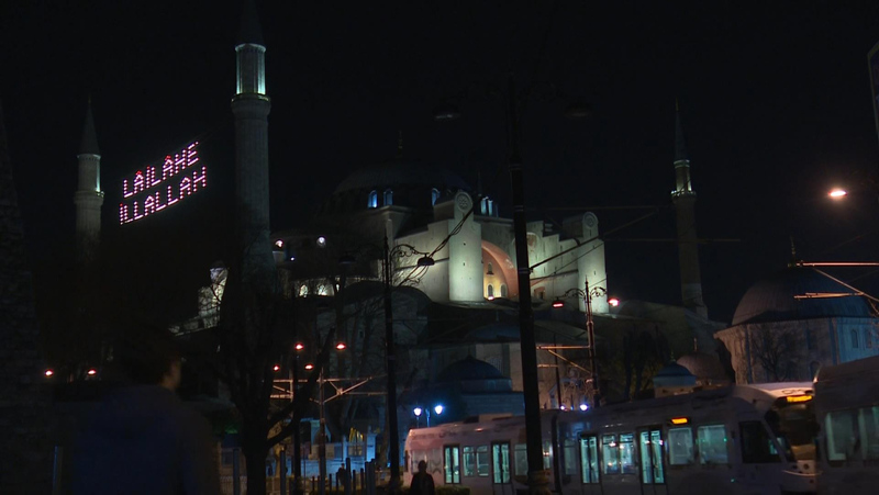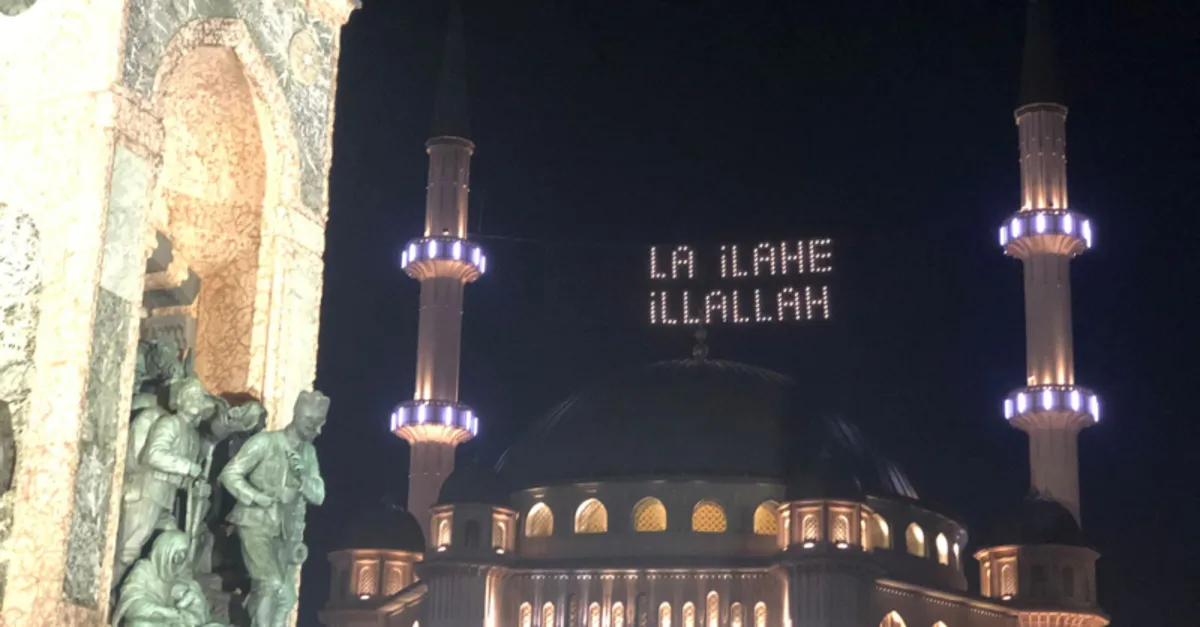 Taksim Camii ile Ayasofya Camii'nde iki minare arasına 'La İlahe İllallah' yazılı mahyalar asıldı.