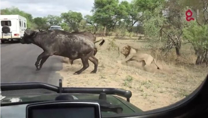 Bufalolardan biri cesaret gösterip aslanlara karşılık vermeye çalışıyor.