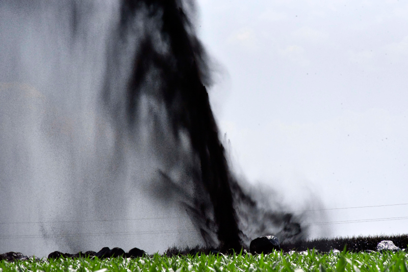 Patlayan petrol boru hattından metrelerce yükseğe ham petrol fışkırmaya başladı.