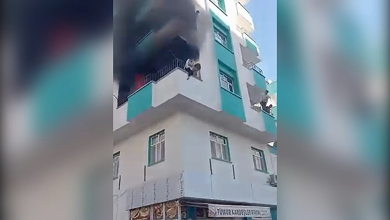 Genç kız ve çocuğun yangından kaçmak için balkondan atlayışları çevredeki vatandaşların cep telefonu kameralarına yansıdı.