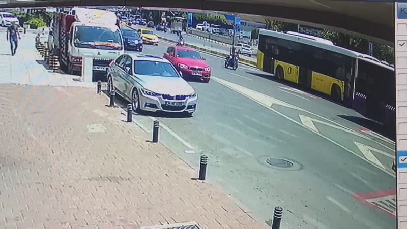 Arkadan gelip şerit değiştiren motosikletli iki otobüsün arasında geçiş mesafesi kalmayınca frene bastı, bu sırada direksiyon hakimiyetini kaybeden motosikletli sol şeritte ilerleyen İETT otobüsünün yanına düştü.