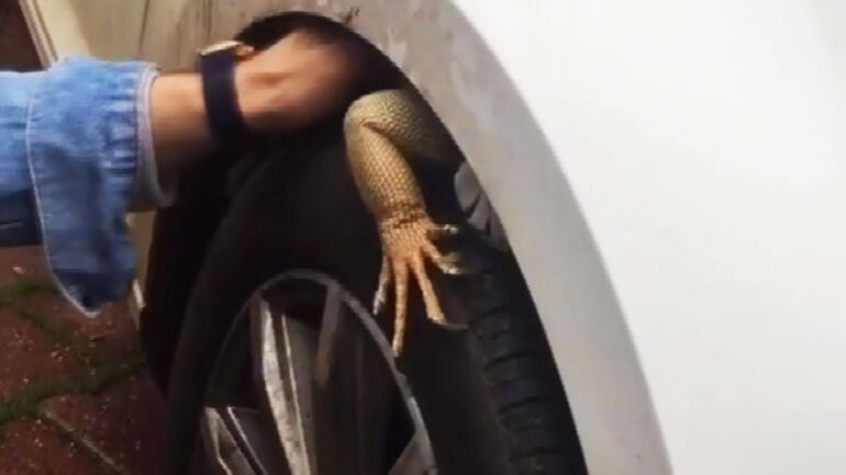 İguana uzun uğraş sonrası aracın ön lastiğinden çıkarılırken, görüntü "Lara'da milletin arabasının altına kedi kaçar, bizimkilere iguana kaçıyor abi" notu ile sosyal medyada paylaşıldı.