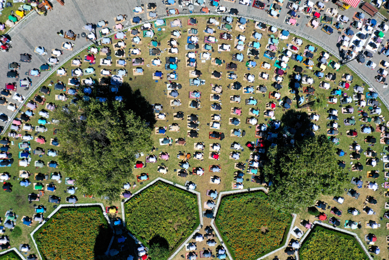 Cuma vaktinde caminin içinin dolması üzerine cemaatin bir kısmı meydanda serili olan hasırlarda, bir kısmı ise Fatih Belediyesi ekiplerince dağıtılan tek kullanımlık seccadeleri yere sererek namazını eda etti.