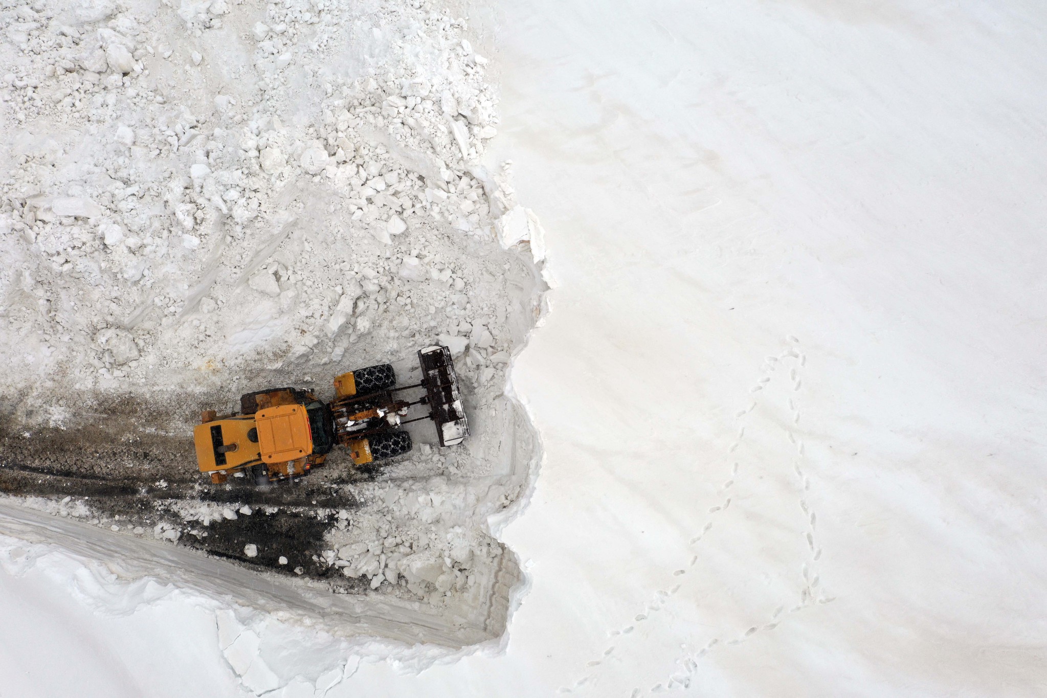 Kente 10 kilometre uzaklıktaki Çavuştepe mevkisinde karla mücadele eden ekiplerin zorlu çalışması drone ile görüntülendi.