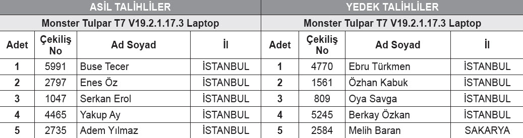 * Çekiliş sonucunda İkramiye olarak 5 kişiye Monster Tulpar T7 V19.2.1.17.3 Laptop ( KDV ve ÖTV dahil birim fiyat 13.299,00TL ), 15 kişiye 1 Adet oyun Mouse, 1 adet Mousepad 1 Adet Klavye ve 1 adet Kulaklıktan oluşan Pusat Aksesuar Paketi 2 (