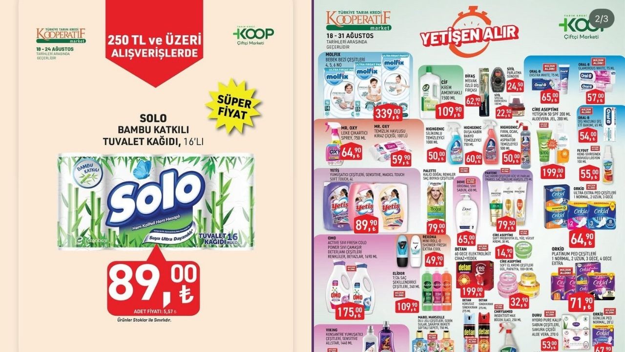 Tarım Kredi Kooperatifi Market, Ağustos ayı aktüel ürünler kataloğunu açıkladı. "Yetişen Alır" sloganıyla müşterilerine ekonomik alışveriş fırsatları sunan KOOP Market, 18 Ağustos 2025 Pazartesi günü başlayan indirim günlerini 31 Ağustos'a kadar sürdürecek. Temel gıda ürünlerinden temizlik malzemelerine, bebek bakım ürünlerinden mutfak gereçlerine kadar geniş bir yelpazede indirimler sunuluyor.
