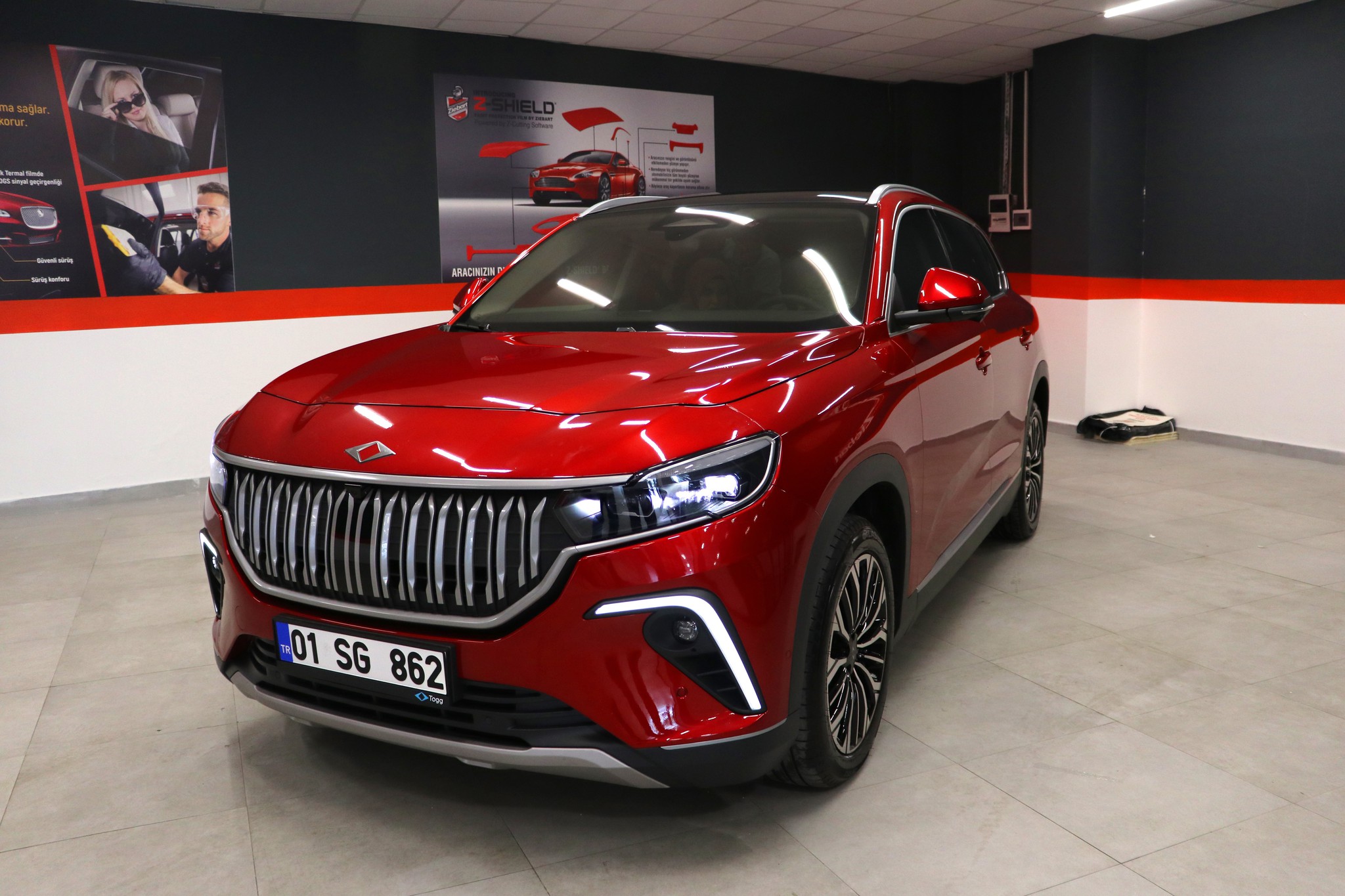 Togg'a modifiyeyi yapan usta İsmet Sütcü, "Tüm camlarına cam filmi yaptık. Ayrıca motor kaputu ve kalan bütün aksamlarına şeffaf kaplama yaptık. Aracın uzun süre boyasını korumak için. Adana'da ilk defa bize kısmet oldu, tabi ki mutluyuz.