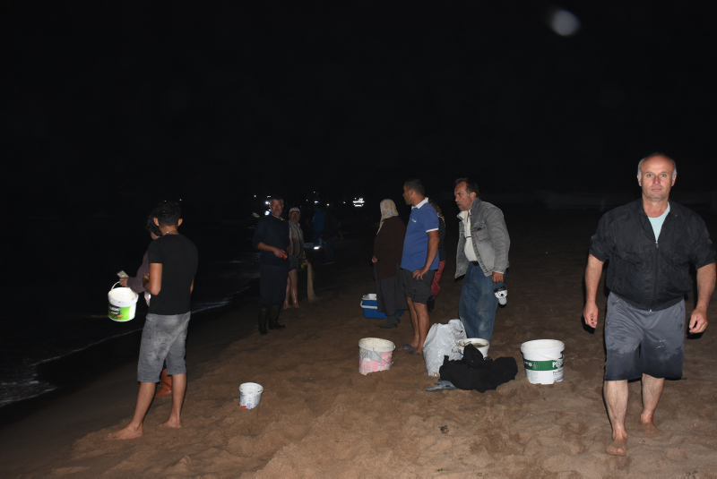 Kadını erkeği çok sayıda vatandaşın ellerinde fenerlerle kıyıda biriken balıkları topladığı anlar ilginç görüntü oluşturdu.