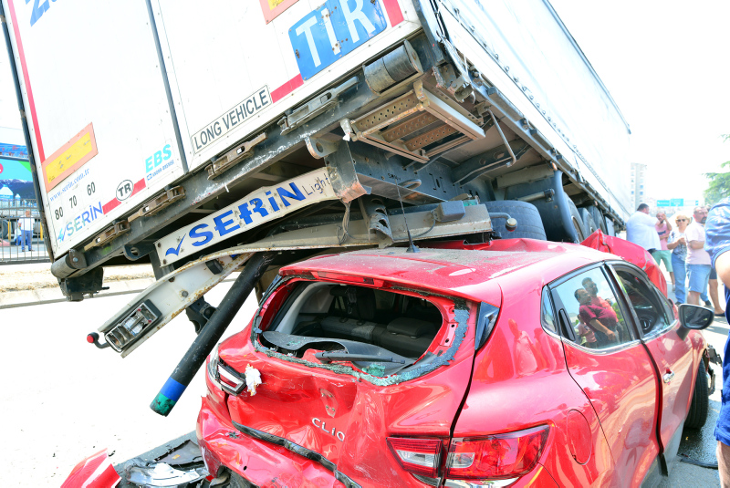 Çarpmanın şiddetiyle savrulan otomobil, önündeki TIR'ın dorsesinin altına girdi.