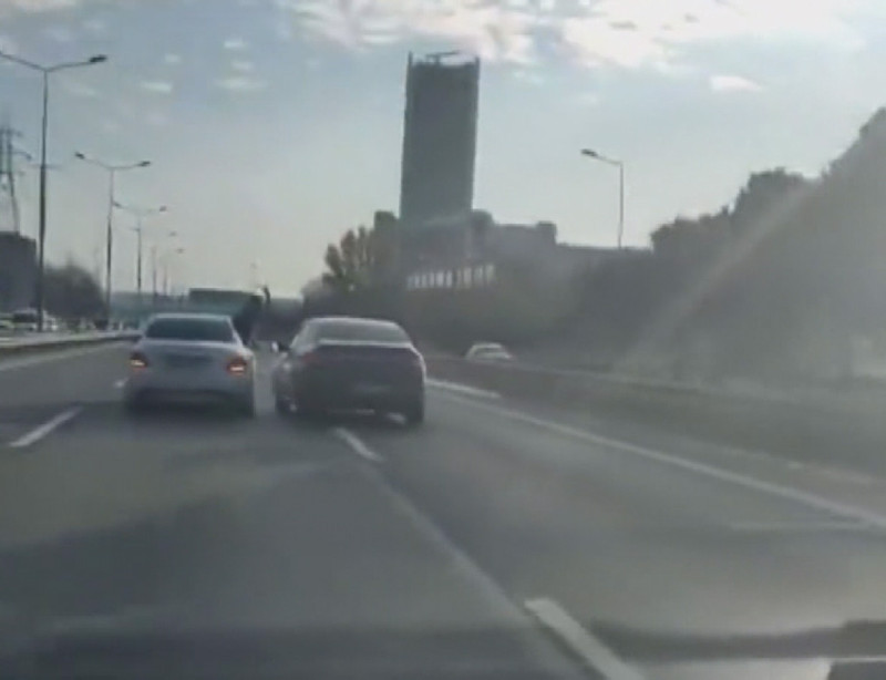 Basın Ekspres Atatürk Havalimanı önünde ilerleyen iki otomobilin sürücüsü trafikte tartışmaya başladı. 3 şeritli yolu paylaşamayan sürücüler birbirlerinin yolunu kesti, zaman zaman da araçlarını adeta birbirine sürterek ilerledi.