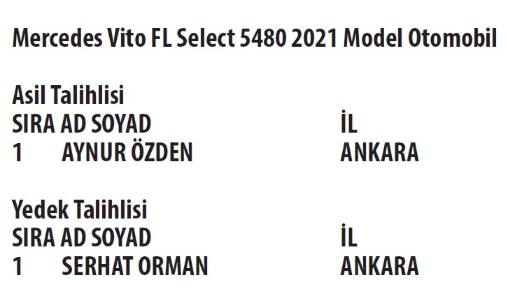 MERCEDES VITO FL SELECT S480 2021 MODEL OTOMOBİL KAZANAN ASİL TALİHLİ VE YEDEK TALİHLİSİ.