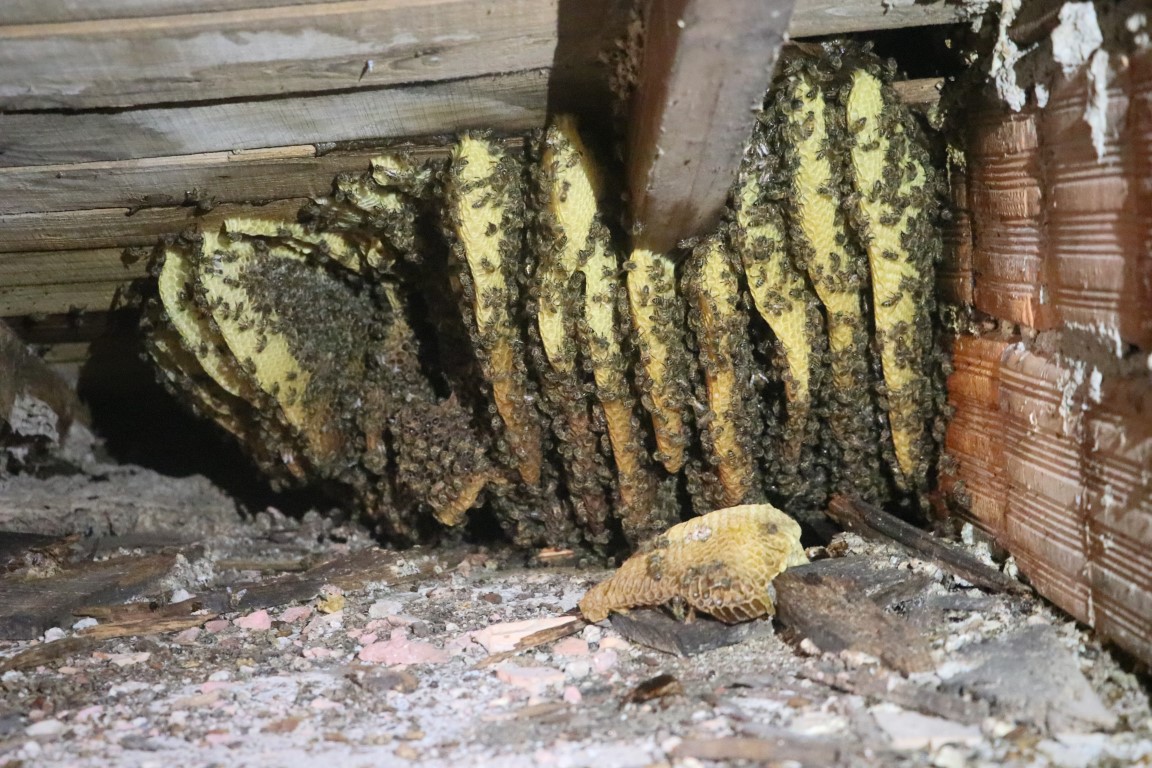Sesin geldiği noktayı tespit etmeye çalışan Kurt, evin çatısını inceledi. Dar olan çatı kısmına sürünerek girebilen Kurt, el feneriyle yaptığı kontrolde buradaki bir noktaya arıların petek yaptığını gördü.