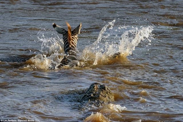 Kenya'da nehri geçmeye çalışan genç zebra bir anda kendini iki timsahın arasında buldu.