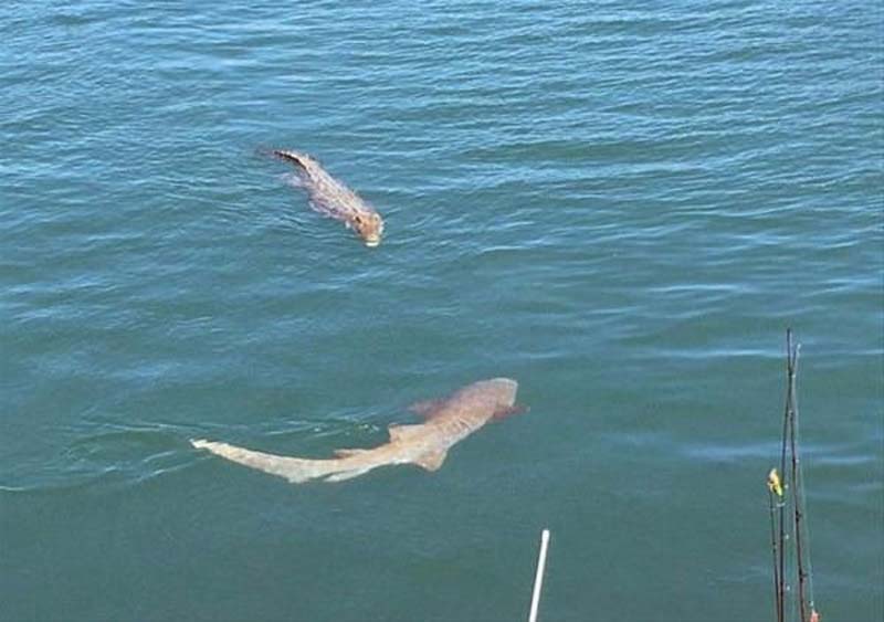 Tam oltalarını atacakken dev bir timsah ile köpek balığının teknelerine çok yakın bir yerde karşı karşıya geldiklerini gördüler.