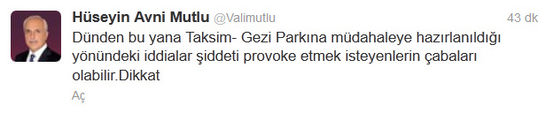 Vali Hüseyin Mutlu ise bugün attığı tweette şunları söyledi: "Dünden bu yana Taksim- Gezi Parkına müdahaleye hazırlanıldığı yönündeki iddialar şiddeti provoke etmek isteyenlerin çabaları olabilir. Dikkat"