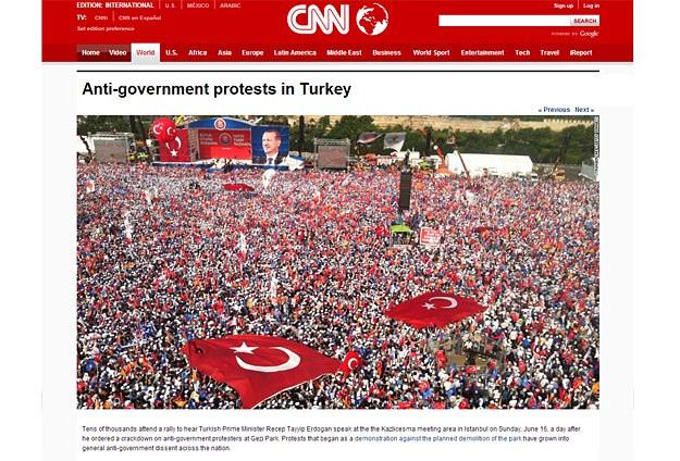 Uluslararası yayın kuruluşu CNN, resmi internet sitesinde oluşturduğu "Türkiye'de hükümet karşıtı gösteriler" başlıklı fotoğraf galerisinde Başbakan Recep Tayyip Erdoğan'ın İstanbul Kazlıçeşme'de düzenlenen "Milli İradeye Saygı" mitinginden yüz binlerin yer aldığı bir kareye yer verdi.