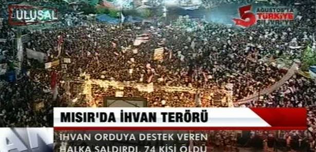 Ulusal Kanal'da, "Mısır'da İhvan terörü" başlığı kullanılarak verilen haberde, 32 milyon kişinin cuntaya destek için sokaklara indiği söylendi.