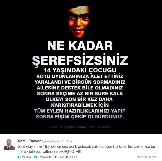 AK Parti Gaziantep Milletvekili Şamil Tayyar, Berkin Elvan'ın ölümünün Gazi Mahallesi olaylarının 19. yıl dönüme denk getirildiğini savunarak, "Berkin'in fişi çekildiyse bu sözler az bile" ifadelerini kullanıp "Ne kadar şerefsizsiniz" başlığıyla Elvan'ın resminin yer aldığı bir yazıyı paylaştı.