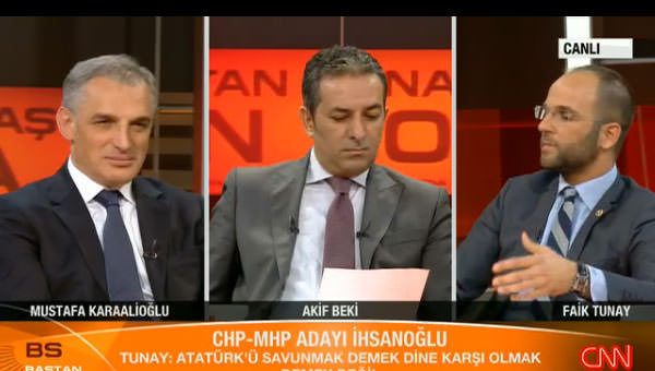 CNN Türk'te yayınlanan Baştan Sona programında yaklaşan cumhurbaşkanlığı seçimi masaya yatırıldı. CHP ve MHP'nin Ekmeleddin İhsanoğlu'nun Cumhurbaşkanı adayı olarak gösterilmesi hakkında değerlendirme yapan CHP İstanbul Milletvekili Faik Tunay Başbakan Erdoğan ile Ekmeleddin İhsanoğlu hakkında değerlendirme yaparken Başbakan hakkında övgü dolu sözler söyledi ve başarı bir politikacı olduğunu belirtti. Programa konuk olarak katılan Star Medya Grup Başkanı Mustafa Karaalioğlu CHP ve MHP'nin Ekmeleddin İhsanoğlu'nu aday göstermesinin samimi olmadığı belirterek 'Bugün Başbakan'a oy vermeyi düşünen hiç kimse Ekmeleddin İhsanoğlu aday oldu diye gidip oy vermez. Muhtemelen kendisi de bütün oylarını AK Parti'ye vermiştir 'dedi