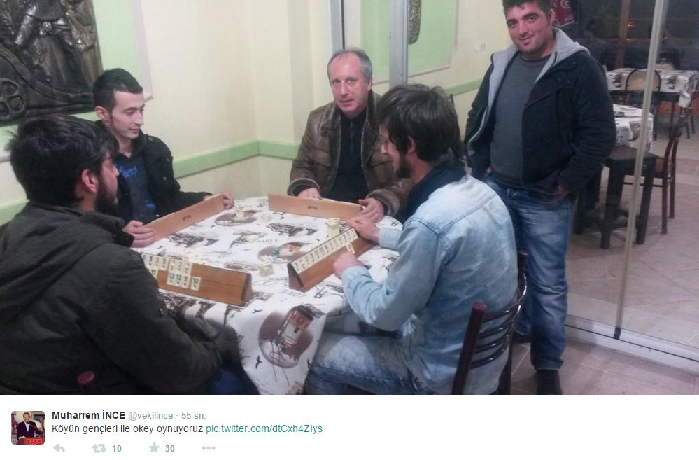 Kurultay'daki başarısızlığının ardından, siyasete Yalova Milletvekili olarak devam eden Muharrem İnce, resmi Twitter hesabından "Köyün gençleri ile okey oynuyoruz" notuyla kahvede gençlerle okey oynarken çekildiği fotoğrafını paylaştı.