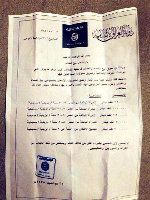 Irak'ta öldürülen IŞİD'in 'emir' statüsünü verdiği üst düzey bir yöneticisinin üzerinden çıkan ve örgütün mührünün bulunduğu belgede, IŞİD tarafından bir pazar kurulduğu, burada Hıristiyan ve şeytana tapan kadınların satıldığının yazıldığı belirtildi.