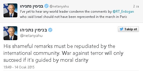 Netanyahu ''Paris'teki yürüyüşte İsrail'in temsil edilmemesi gerektiğini söyleyen Erdoğan'ı kınayan herhangi bir dünya lideri henüz görmedim. Utanç verici yorumları uluslararası toplum tarafından reddedilmeli. Teröre karşı savaş ancak ahlaki bir açıklık eşlik ederse başarıya ulaşabilir'' mesajını paylaştı.