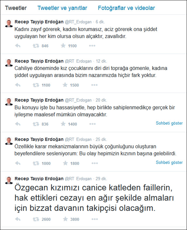 Cumhurbaşkanı Recep Tayyip Erdoğan, Twitter hesabından Tarsus'ta hunharca katledilen Özgecan Aslan ile ilgili bir Tweet attı.