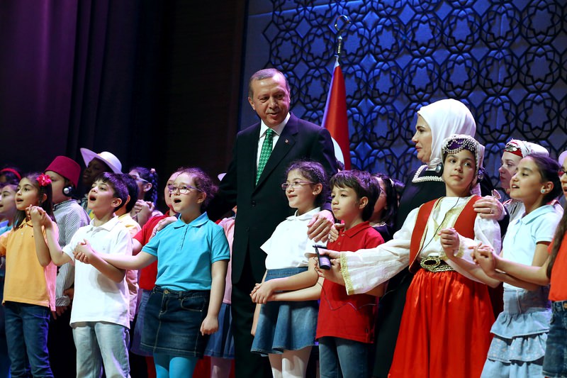 Cumhurbaşkanı Erdoğan, konuşmasının ardından eşi Emine Erdoğan ve çocuklarla, sahnede şarkıya eşlik etti.