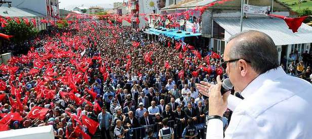 ''Diyorlar ki Diyanet İşleri'ni kapatacağız. Din derslerini kaldıracağız. Kaynak mı? Diyanet İşleri Başkanının altındaki Mercedes. Halbuki altlarında spor arabalardan geçilmiyor. Yarın bir müjde duyabilirsiniz. Bu müjde Diyanet İşleri Başkanımız ile ilgili olacak. Diyanet İşleri makamına bu denli saldırmayı hedef göstermeyi kendisine yol gösteren bir siyasi anlayışa ne Kürt, ne Arap, Türk, Laz, Boşnak hiçbiri pirim vermeyecek. Şimdi HDP bizim Kabe'miz Taksim'dir diyor. Bizim tek Kabemiz var. Benim Kürt, Laz, Türk, Zaza kardeşlerim 7 Haziran'da gerekli dersleri bunlara vereceğiz. Benim Cumhurbaşkanı olarak canım yanıyor.