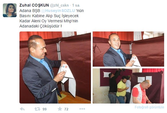 Ancak Sözlü, seçim yasaklarını çiğneyerek bir skandala imza attı ve telefonunun dahi kabine alınması yasakken basın mensuplarını kabine alan Sözlü, MHP'ye oy verdiğini fotoğraflattı. Sandık görevlilerinin ise yaşanan bu olay karşısında sessiz kalması ve tutanak tutmaması şaşkınlıkla karşılandı.