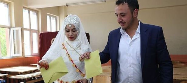 Gelin Şenol, AA muhabirine yaptığı açıklamada, düğünü böyle bir tarihe geldiği için çok mutlu olduğunu belirterek, "Düğünümüz bugüne denk geldi. Oyumuzu kullandık, buradan salona gidiyoruz. Gelinliğimle oy kullandım, mutluyum" dedi.