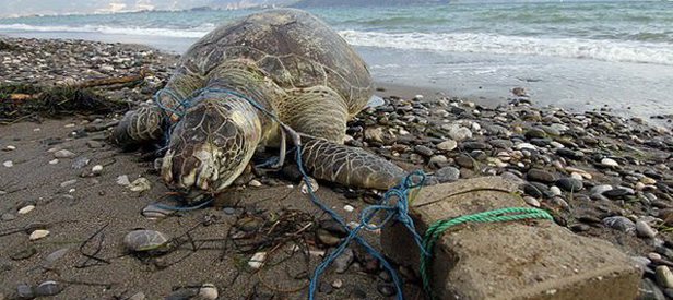 Muğla'nın Fethiye ilçesinde denizde başı ve yüzgecine parke taşı bağlanmış ölü yeşil deniz kaplumbağası bulundu.