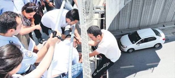 İstanbul Çağlayan'da dün bir üst geçidin korkuluklarına çıkan Necati C., yön tabelalarının üstüne oturdu. Çevrede bulunan vatandaşlar Necati C.'yi intihar etmemesi için ikna etmeye çalıştı.