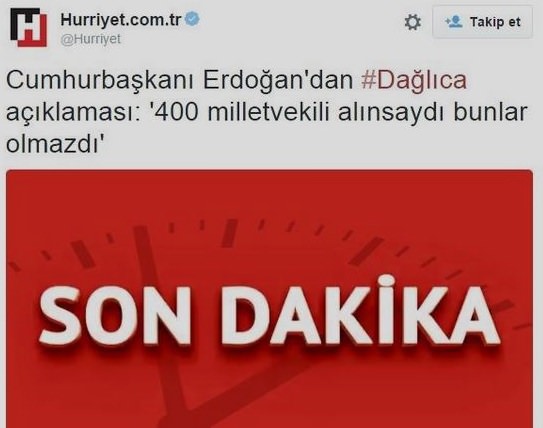 Canlı yayın esnasında Cumhurbaşkanı Erdoğan'ın Dağlıca'daki saldırıya ilişkin ifadelerini çarptıran Hürriyet, söz konusu demeci '400 vekil' konusuyla birleştirerek yayınladı.
