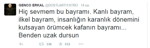 Tiyatronun ünlü isimlerinden Genco Erkal'ın sosyal paylaşım sitesi Twitter'dan yaptığı 'kurban bayramı' açıklaması büyük tepki topladı