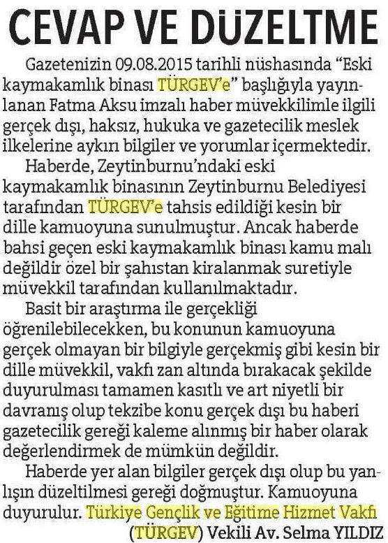 Gazetenizin 09.08.2015 tarihli nüshasında "Eski kaymakamlık binası TÜRGEV'e" başlığıyla yayınlanan Fatma Aksu imzalı haber müvekkilimle ilgili gerçek dışı, haksız, hukuka ve gazetecilik meslek ilkelerine aykırı bilgiler ve yorumlar içermektedir.