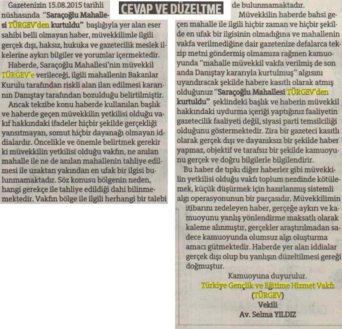 Gazetenizin 15.08.2015 tarihli nüshasında "Saraçoğlu Mahallesi TÜRGEV'den kurtuldu" başlığıyla yer alan eser sahibi belli olmayan haber, müvekkilimle ilgili gerçek dışı, haksız, hukuka ve gazetecilik meslek ilkelerine aykırı bilgiler ve yorumlar içermektedir.
