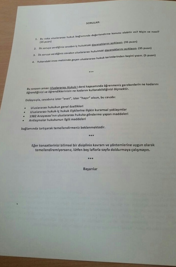 Türkiye’yi ayağa kaldıran bildiriye imza atan 1128 akademisyen arasında yer alan Ankara Üniversitesi Siyasal Bilgiler Fakültesi'nde görevli Prof. Dr. Gökçen Alpkaya bütünleme sınavında PKK propagandası yapılan bildirinin tam metnini vererek öğrencilere Uluslararası Hukuk bağlamında bunun nasıl değerlendirileceğini sordu.