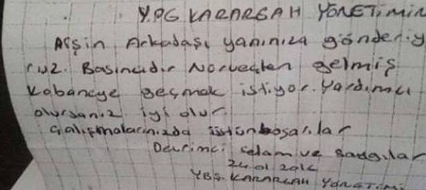 Burada Norveç vatandaşı olduğu öğrenilen İsmaeli Afshin adlı şahsın üzerinde yapılan aramada, YPG'ye yazılmış not bulundu ve şahsın Kobani'ye gitmeye çalıştığı öğrenildi. "YPG Karargah Yönetimine" başlıklı notta, şu ifadeler yer aldı:"Afşin arkadaşı yanınıza gönderiyoruz. Basıncıdır, Norveç'ten gelmiş. Kobane'ye geçmek istiyor. Yardımcı olursanız iyi olur. Çalışmalarınızda üstün başarılar. Devrimci selam ve saygılar. 24.01.2016 YBŞ Karargah Yönetimi."