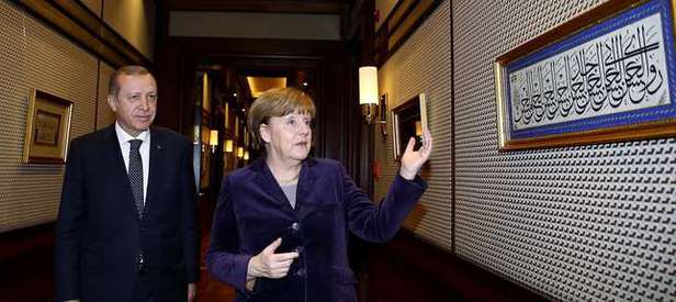 Merkel duvarda asılı olan hat sanatıyla yazılmış tabloyu görünce Cumhurbaşkanı Erdoğan'a 'sen de böyle yazabiliyor musun' diye sordu.