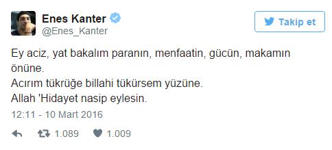 Türkoğlu'nun devlet makamında alacağı yeni göreve Twitter hesabından tepki gösteren Kanter, sosyal medyadan Türkoğlu'na yönelik kullandığı, 'Ey aciz, yat bakalım paranın, menfaatin, gücün, makamın önüne. Acırım tükrüğe billahi tükürsem yüzüne. Allah 'Hidayet nasip eylesin' ifadeleri büyük tepki topladı.
