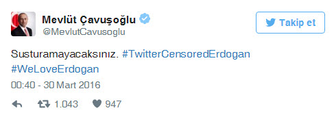 Bakan Çavuşoğlu, "Susturamayacaksınız. #TwitterCensoredErdogan #WeLoveErdogan" ifadelerini paylaştı.