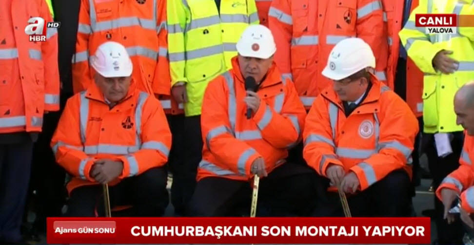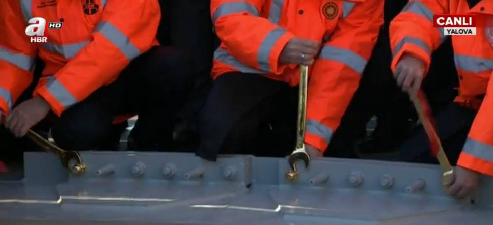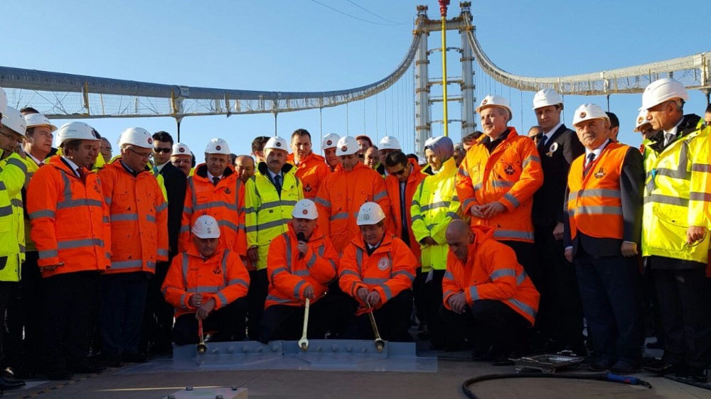 Cumhurbaşkanı Recep Tayyip Erdoğan ve Başbakan Ahmet Davutoğlu, iş kıyafetlerini giydi ve baretleri takarak köprünün üzerine geldiler. Ulaştırma Bakanı Binali Yıldırım, Erdoğan ve Davutoğlu'na bilgi verdi. Daha sonra Erdoğan ve Davutoğlu törenle vidaları sıktı. Cumhurbaşkanı Recep Tayyip Erdoğan, "Son tabliyenin vidalarını Başbakanımız ve Ulaştırma Bakanımız ile birlikte sıkacağız. Kaynağını görevli arkadaşlarımız ayrıca yapacaklar. Bugün farklı bir uygulama yapıyoruz. Gerçekten dünyada 4.büyük özelliklere sahip bir köprü ile iftihar ediyoruz. Milletimiz için tüm insanlık için hayırlı olsun" diyerek besmele ile vidayı sıktı.