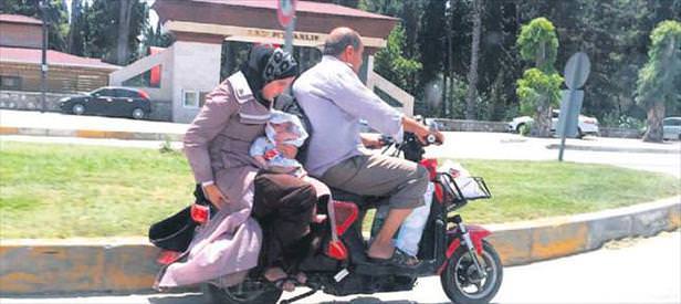 Adana'dan geçen uluslararası D-400 Karayolu'nda elektrikli bisikletle yolculuk eden Suriyeli aile görenlerin yüreğini ağzına getirdi. Yüreğir İlçesi'ndeki Özgür Mahallesi'nden çıkan sürücünün arkasında sırt sırta oturan ve birinin de kucağında bebek olan 2 kadının bulunduğu elektrikli bisiklet, görenleri hayrete düşürdü. Hareket halindeki araçların yanlarından her geçişinde sallanan bisikletteki kadınlar, düşmemek için büyük çaba harcadı. Tehlikeye aldırmayan aile, araçların arasından kaybolup gitti.