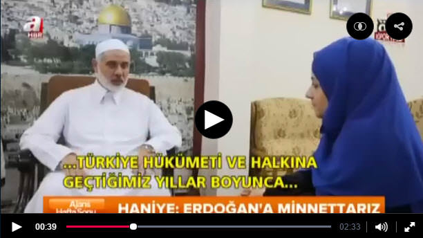 Sayın Recep Tayyip Erdoğan'a, Türkiye hükümeti ve halkına geçtiğimiz yıllar boyunca Gazze'ye uygulanan ambargonun hafifletilmesi için gösterdikleri çabalar dolayısıyla minnettarız. Kendisine Gazze'de yaşayan halkımızın 10 yıldır yaşadığı büyük acıları sona erdirmek için yaptıklarından dolayı müteşekkiriz.